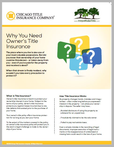 Enroll in DocPrep Online, an internet-based document preparation system offered by Chicago Title Insurance Company, giving you access to a large variety of documents. Complete and submit title opinion forms electronically to City of Oaks Title, LLC or the issuing agent of your choice.